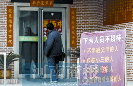 昨日下午,鄭州市民趙先生致電河南商報(bào)稱,鄭州一家飯店門前,立了一個牌子來“挑顧客”。下午3時(shí)30分許,鄭州市黃河路南陽路交叉口向西約300米,路北一個飯店門前,記者見到了這個牌子。1平方米見方的牌子上寫著,“下列人員不接待:不孝敬父母的人、包養(yǎng)小三的人、公款消費(fèi)的人、不相信房價(jià)會降的人”。