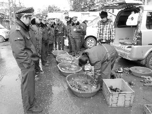照片下方還配了一段文字說明——1月29日,南京市玄武區鎖金村一處路口,10多位身著制服的城管隊員肅立圍觀占道經營的魚攤,不一會,攤主便抵擋不住,匆忙撤攤。