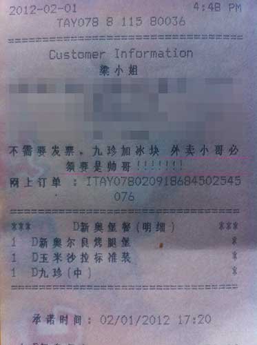2月初,網友“bosnia_我是考攻”的一條微博,引來了數萬次的轉帖,回應數也接近5000條。按照該網友的說法,自己在點單時提出了一項“特別要求”“不需要發票,九珍加冰塊,外賣小哥必須要是帥哥”。原本只是一時興起提了個“苛刻”的要求,想不到等到送餐時間,果然來了一位“眼睛大大圓圓、皮膚白白凈凈、又高又瘦的外賣小哥”。網友又驚又喜,她表示,自己整個人都快笑癱了。“而這位外送小哥則很不好意思地用手捂臉,指著小票上的要求說,‘您這個……這個……我……滿意吧?’” 最神奇的是,10分鐘后,網友還接到了來自肯德基的確認電話,詢問:“(餐品)的數量質量都沒問題是嗎?給您送餐的孩子還算漂亮嗎?”