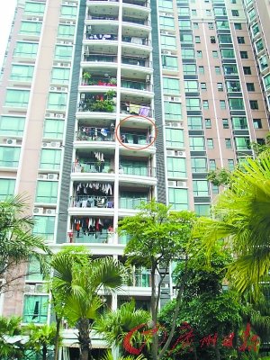 昨天中午時分,記者來到了事發的樟木頭鎮碧河花園小區29號樓前發現,事發地一樓的住戶與工人正在忙著修繕被砸壞的遮陽棚,該遮陽棚頂部靠右側中心處有一塊近一平方米大小的“破洞”。記者順著破洞向樓層正上方看去,發現該棟樓事發七層的陽臺上還掛了一些女人的衣服。