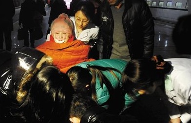 昨日晚上8時48分,G150次列車駛進了北京南站。周巖緊裹著粉紅色的睡衣、戴著帽子,顯得有些疲憊,在母親的攙扶下走下了火車。她坐上輪椅后出站,接診醫院的救護車早已在出站口等候了。
