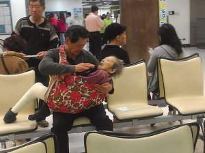 一方花布兜住一位瘦弱、頭發花白的老婦人,在肩膀處打個結,中年男子一手托著老人,一手正要幫老人做什么。背景是醫院候診廳。