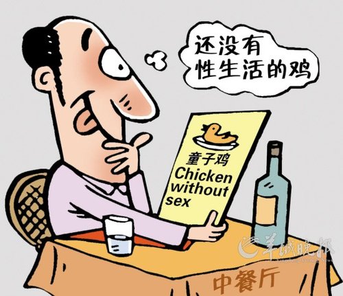 而此前曾被翻譯成Chicken without sex(還沒有性生活的雞)的童子雞此次被正名為Spring chicken(直譯為春雞)。陳琳告訴記者,將童子雞的英文名稱定為Spring chicken是符合中英文語言特征的。童子雞的中文含義是沒有交配的小雞,而英語中一般用春、夏、秋、冬來形容小動(dòng)物的年齡特征,初生到性成熟前的雞一般用Spring chicken來表示。