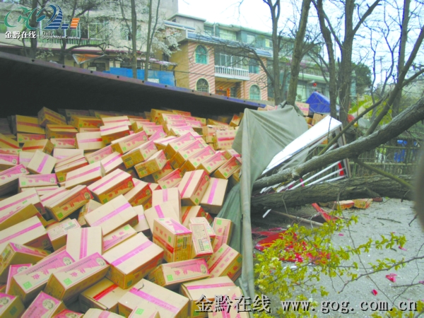 金黔在線訊 昨日下午2時許,貴陽市龍洞堡見龍洞路,一輛滿載老干媽油辣椒的大貨車爆胎失控,車子側翻路邊,老干媽油辣椒散落一地,并撞倒路邊的一棵大樹,所幸未造成人員受傷。