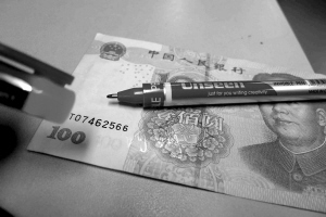 但本報官方微博轉發這一消息后,不少網友回復稱,“沒有這種可能,怎么會出現這種罕見錯版幣?”“那"哈哈"二字,是拿隱形筆寫的,那種筆寫出來的字要用驗鈔的熒光燈才能照出來。” 昨日下午,記者在五塊石一家文具店花了15元,買到了一支傳說中的隱形熒光筆。這種隱形熒光筆外觀和普通中性筆并無多大差別,筆芯粗細和圓珠筆芯一樣,只是顏色為熒光色。隨后,記者掏出一張百元鈔票,在上面寫上“呵呵”兩字。寫好之后,鈔票上肉眼是看不到這兩個字,但用熒光燈一照,鈔票上立即出現了“呵呵”二字。 記者所做實驗的結果跟網友所說的完全相符,簡單破解了“哈哈”百元鈔的“神奇”。