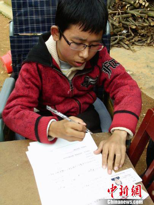 羅盛林身高不足1.2米,體重不足30公斤,被人們稱為“袖珍人”,從初中患上腳掌疼病之后,病情一直不見任何好轉(zhuǎn)。羅盛林的爸爸羅旺貴告訴記者,兒子的肌肉萎縮的情況越來越嚴重,小腿只有甘蔗一般粗。由于雙腿難以負荷身體的重量,目前只能坐在輪椅上活動,和癱瘓沒什么兩樣。