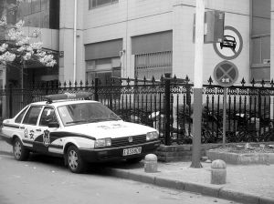 昨日下午,在石榴新村那條通道的一塊禁停標識下,駛來一輛警車,車牌號為“蘇A3380警”。據附近居民介紹:這輛警車駛到禁停標識下后,干脆停泊下來,而且一側車輪軋在路邊的路牙上,另一側的輪子則泊在馬路上。