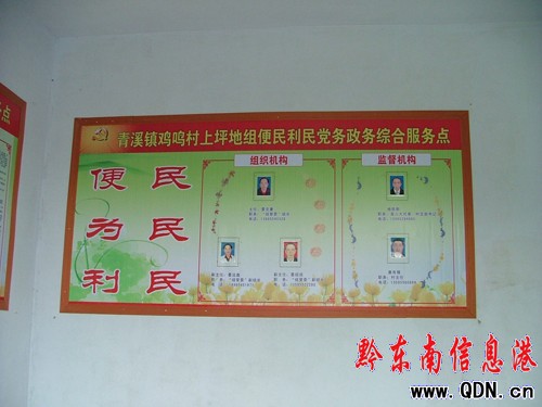 本港訊 (楊權)自開展便民利民服務以來,青溪鎮黨委、政府狠抓便民利民服務的縱向延伸,將便民利民黨務政務綜合服務窗口向前移,在資金極為緊張的情況下,籌資建成了全鎮首個組級便民利民黨務政務綜合服務點——青溪鎮雞鳴村上坪地組便民利民黨務政務綜合服務點,并開展便民利民服務工作。自2010年8月6日建成以來,共開展便民利民代辦服務事項13項,百姓好評如潮。