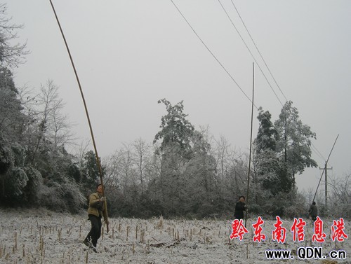 尚寨村貓貓洞是該鄉居住海拔最高的村寨之一,電線結冰厚度已達3厘米,隨時都有拉斷電線的危險,該村掛村領導粟周學、駐村干部及電力部門技術員組織群眾除去主干線、支線的冰柱,減輕電線負重。在貓貓洞全體村民的積極參與下,經過近兩個小時的除冰瘦身工作,一根根肥大笨重繃緊的電線又回到瘦小輕松的自然狀態,又可以抵卸5天以上雪凝災害天氣了。(楊政國)