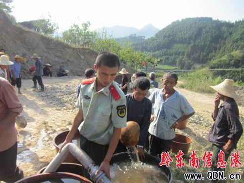 消防官兵到達(dá)地點后,迅速開始鋪設(shè)水帶,向村民拿來的桶中加水,官兵們往返于屯州山路和縣城之間來回運水2次8噸水,解決了群眾施工的用水問題。