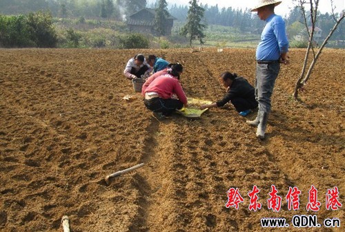 今年,銅鼓鎮遭到嚴重旱災影響,造成農業生產減收。為了彌補重災之年給農民造成的損失,銅鼓鎮花橋農場職工王平結合地方資源優勢,多方聯系農業項目,通過到太子參主產地施秉縣牛大場鎮、黃平縣一碗水鎮實地考查,根據岔路村耕地資源豐富,土壤肥沃,氣候溫涼,晝夜溫差大,比較適宜塊根作物生長的特點,經與貴州省百靈制藥集團聯系并簽定太子參種植回收合同,在岔路村實施30畝的太子參種植示范點,并帶動周邊七戶農戶種植16畝,一共實施46畝太子參種植。為了確保示范成功,貴州百靈集團提供產前產中及產后一條龍技術服務,按每公斤260元的價格收購成品太子參。