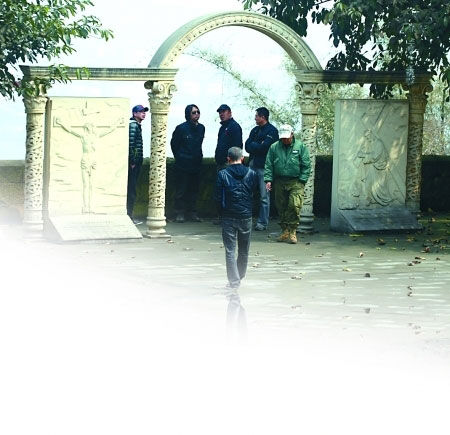 雞冠石上的慈母山天主堂建于1911年,傳說圣母瑪利亞曾顯圣于此,因此這座山被命名為慈母山。1939年夏,蔣介石偕夫人宋美齡來此參觀,曾贊嘆“真福地也”。昨日馮小剛在里面看景時,認真地看了走廊的每個角落,說了一句“這廊子可以拍”,慈母山天主堂也成為《溫故1942》的一大重要外景地。值得一提的是,馮小剛到達的時候,正好有信徒在做彌撒,當他聽到贊美詩之后忍不住驚呼“居然是和聲!”,這也讓記者不禁猜測,難道馮導還要拍唱詩班?