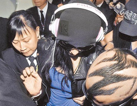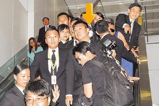 張柏芝(箭頭處)昨在香港機場被保全重重包圍護駕