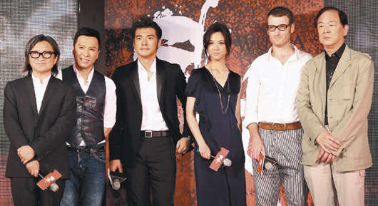 《武俠》昨天在臺首映,導演陳可辛(左起)、甄子丹、金城武、湯唯、攝影師Jake、王羽齊聚。