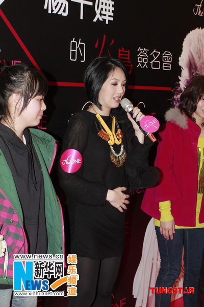 21日,楊千嬅挺大肚出席新專輯《火鳥》的簽名會,身穿黑色連衣裙的千嬅亦有穿一吋高跟鞋上陣,丈夫丁子高全程在臺下著緊看著她的一舉一動。