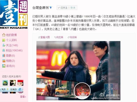 《臺(tái)灣壹周刊》新浪官方微博稱:“已婚好男人破功黃品源帶19歲小模上摩鐵// 1990年因一曲《你怎么舍得我難過》紅遍大街小巷的黃品源,進(jìn)演藝圈20多年來維持專情好男人形象,如不沾鍋幾乎沒有緋聞;但本刊日前直擊,43歲的他與一名19歲的小模小慧,在傍晚天還亮?xí)r,前往大直高級(jí)摩鐵(motel即汽車旅館),完美老公遇上“青春ㄟ肉體”也徹底大破功�!辈⒏缴宵S品源與嫩模坐上計(jì)程車的照片,其中有他們攔下計(jì)程車時(shí)的清晰正面照。(新娛)